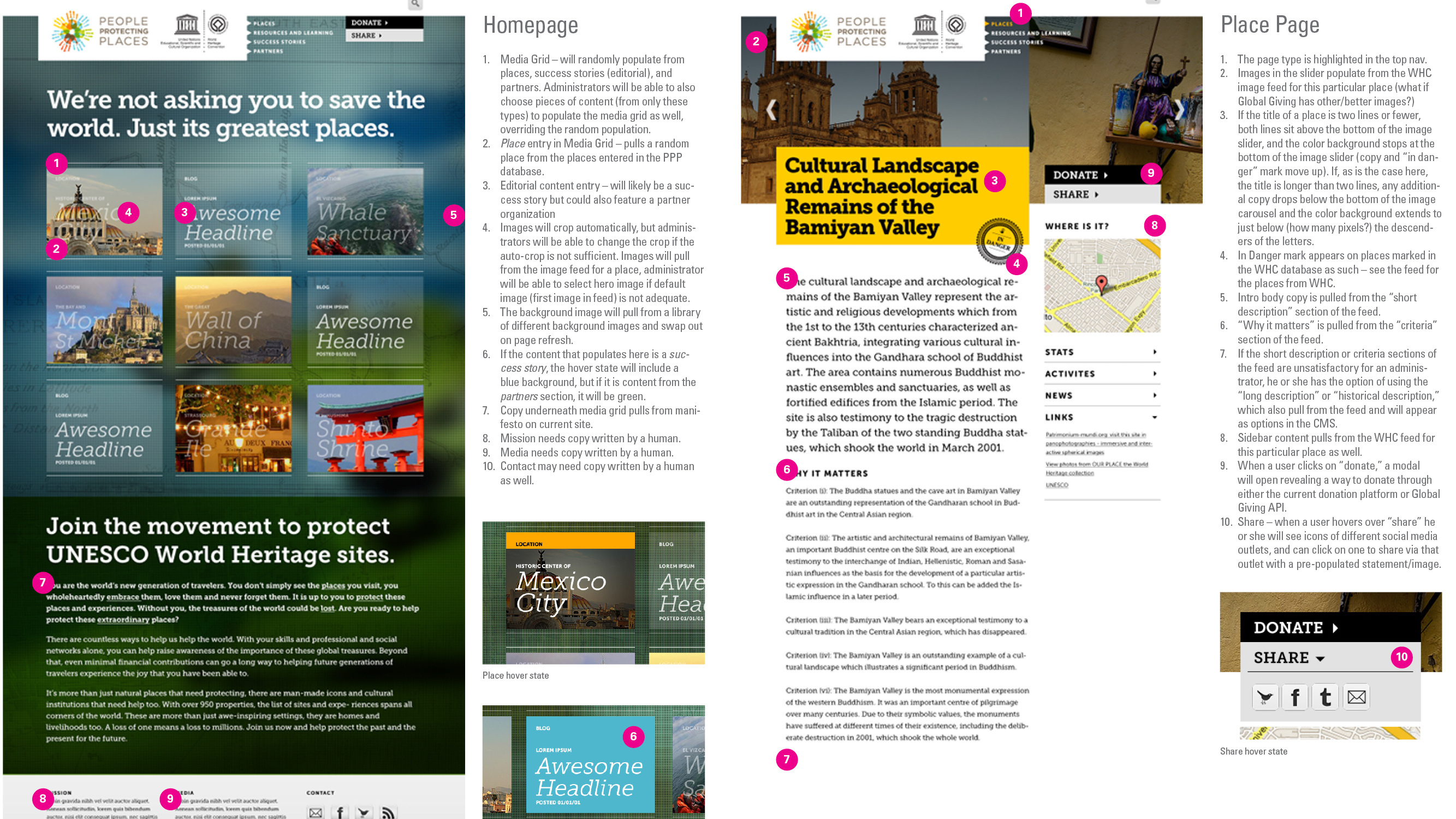 Our developer for this project, for example, is a friend of ours who lives in New York. Because he couldn't be with us in person for every meeting and whiteboard session, we needed to make him aware of every little decision we made regarding the site, particularly as we wrapped up the design phase. We therefore created a detailed set of annotated designs, which specified not only the visual design of the site, but also specified the behaviors and places from which data would be pulled from different databases at the WHC. These annotated specs even included the language that would auto-populate text fields when users shared a place or photo on different social networks.